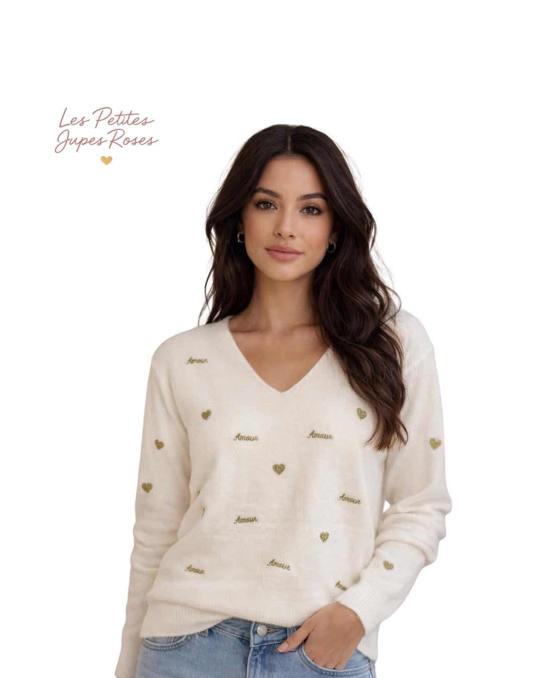 Parsemé de petits cœurs dorés et de broderies “Amour”, ce pull apporte une touche romantique et joyeuse à chaque tenue. Sa coupe droite et son col en V flatteront toutes les morphologies, tandis que sa matière agréable en fait un indispensable de saison.