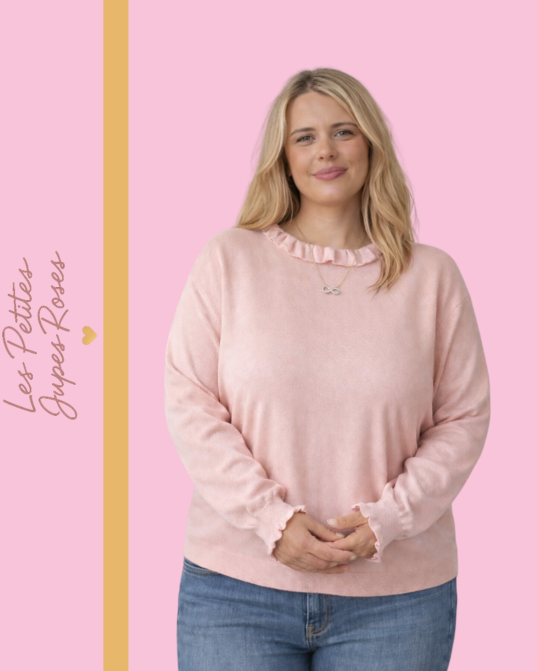 Pull rose poudré à détails volantés – douceur & féminité